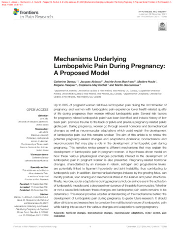 Daneault, C., Abboud, J., Marchand, A.-A., Houle, M., Pasquier, M., Ruchat, S.-M. et Descarreaux, M. (2021). Mechanisms underlying lumbopelvic pain during pregnancy: A proposed model. Frontiers in Pain Research . Article 773988. ISSN 2673-561X DOI 10.3389/fpain.2021.773988