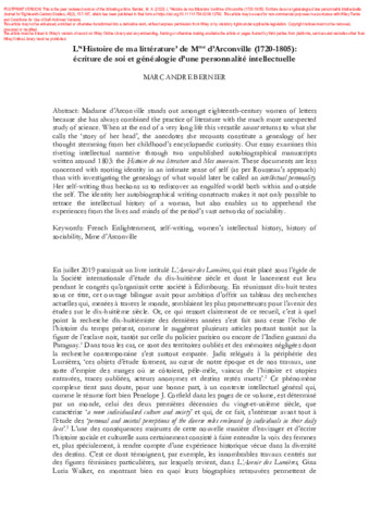 | Mots-clés libres: | French Enlightenment Life writing Autobiography Women’s intellectual history History of sociability Mme d’Arconville |