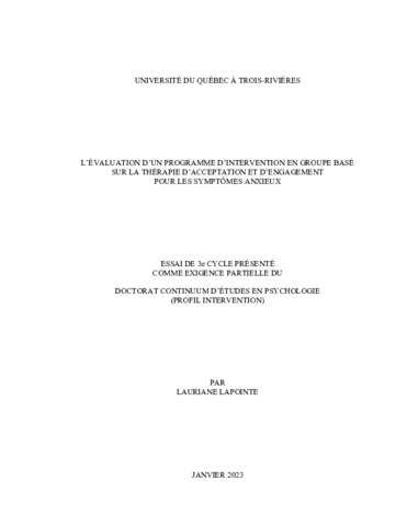 Lapointe, Lauriane (2023). L'évaluation d'un programme d'intervention en groupe basé sur la thérapie d'acceptation et d'engagement pour les symptômes anxieux. Essai. Trois-Rivières, Université du Québec à Trois-Rivières, 104 p.