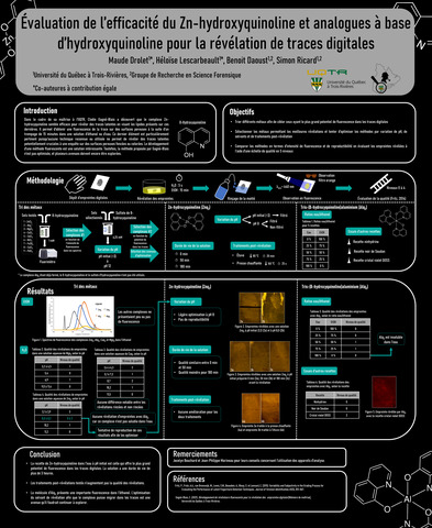 Drolet, Maude, Lescarbeault, Héloïse, Daoust, Benoit et Ricard, Simon (2023). Évaluation de l'efficacité du Zn-Hydroxiquinoline et analogues à base d'hydroxyquinoline pour la révélation de traces digitales. [Affiche]