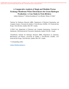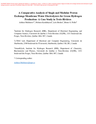 Makhsoos, A., Kandidayeni, M., Boulon, L. et Pollet, B. G. (2023). A comparative analysis of single and modular proton exchange membrane water electrolyzers for green hydrogen production- a case study in Trois-Rivières. Energy, 282 . Article 128911. ISSN 0360-5442 DOI 10.1016/j.energy.2023.128911