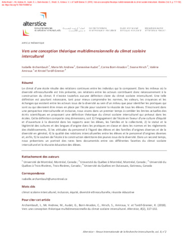 Archambault, I., Mc Andrew, M., Audet, G., Borri-Anadon, C., Hirsch, S., Amiraux, V. et Tardif-Grenier, K. (2018). Vers une conception théorique multidimensionnelle du climat scolaire interculturel. Alterstice, 8 (2). pp. 117-132. ISSN 1923-919X DOI 10.7202/1066957ar