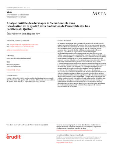 Poirier, É. et Roy, J.-H. (2023). Analyse outillée des décalages informationnels dans l’évaluation de la qualité de la traduction de l’ensemble des lois codifiées du Québec. Meta, 68 (1). pp. 6-37. ISSN 0026-0452 DOI 10.7202/1106325ar