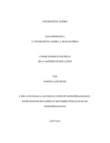 Lajeunesse, Marina (2023). L’éducation par la nature en contexte orthopédagogique : interventions déclarées et retombées perçues par les orthopédagogues. Essai. Trois-Rivières, Université du Québec à Trois-Rivières, 78 p.