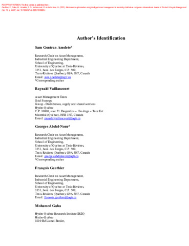 Gauthier, F., Gaha, M., Amelete, S. G., Vaillancourt, R. et Abdul Nour, G. (2023). Maintenance optimisation using intelligent asset management in electricity distribution companies. International Journal of Product Lifecycle Management, 15 (1). pp. 44-67. ISSN 1743-5110 DOI 10.1504/IJPLM.2023.10059254