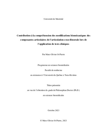 St-Pierre, Marc-Olivier (2023). Contribution à la compréhension des modifications biomécaniques des composantes articulaires de l’articulation coxo-fémorale lors de l’application de tests cliniques. Thèse. Montréal ; Trois-Rivières, Université de Montréal ; Université du Québec à Trois-Rivières, 222 p.
