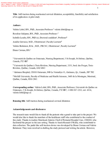 Lebel, V., Galipeau, R., Landry, I., Gervaise, A., Bohémier, V. et Croteau, D. (2024). Self-traction during mechanical cervical dilatation, acceptability, feasibility and satisfaction of its application: A pilot study. Journal of Obstetrics and Gynaecology Canada, 46 (5). p. 102408. ISSN 1701-2163 DOI 10.1016/j.jogc.2024.102408