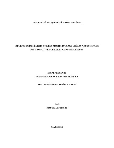 Lefebvre, Maude (2024). Recension des écrits sur les motifs d’usage liés aux substances psychoactives chez les consommateurs. Essai. Trois-Rivières, Université du Québec à Trois-Rivières, 41 p.