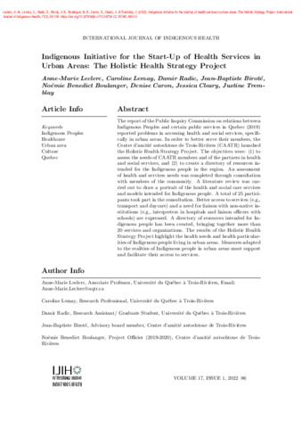 Leclerc, A.-M., Lemay, C., Radic, D., Biroté, J.-B., Boulanger, N. B., Caron, D., Cleary, J. et Tremblay, J. (2022). Indigenous initiative for the start-up of health services in urban areas: The holistic strategy project. International Journal of Indigenous Health, 17 (2). pp. 96-106. ISSN 2291-9376 DOI 10.32799/ijih.v17i2.36734