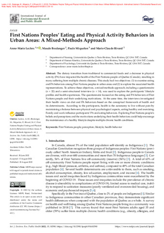 Leclerc, A. M., Boulanger, M., Miquelon, P. et Rivard, M. C. (2022). First Nations peoples’ eating and physical activity behaviors in urban areas: A mixed-methods approach. International Journal of Environmental Research and Public Health, 19 (16). ISSN 1661-7827 1660-4601 DOI 10.3390/ijerph191610390