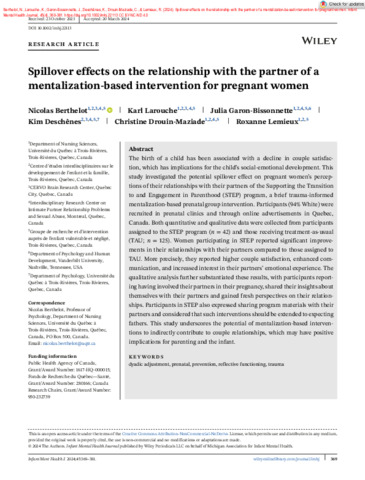 Berthelot, N., Larouche, K., Garon-Bissonnette, J., Deschênes, K., Drouin-Maziade, C. et Lemieux, R. (2024). Spillover effects on the relationship with the partner of a mentalization-based intervention for pregnant women. Infant Mental Health Journal, 45 (4). pp. 369-381. ISSN 0163-9641 1097-0355 DOI 10.1002/imhj.22113