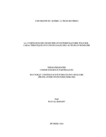 Bahary, Pascal (2024). La confession des homicides en interrogatoire policier : caractéristiques psychosociales des auteurs d’homicide. Thèse. Trois-Rivières, Université du Québec à Trois-Rivières, 168 p.