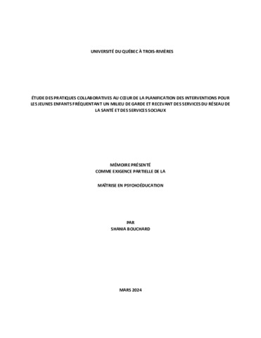 Bouchard, Shania (2024). Étude des pratiques collaboratives au coeur de la planification des interventions pour les jeunes enfants fréquentant un milieu de garde et recevant des services du réseau de la santé et des services sociaux. Mémoire. Trois-Rivières, Université du Québec à Trois-Rivières, 188 p.