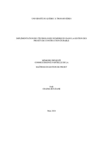Bouziane, Chaima (2024). Implémentation des technologies numériques dans la gestion des projets de construction durable. Mémoire. Trois-Rivières, Université du Québec à Trois-Rivières, 265 p.