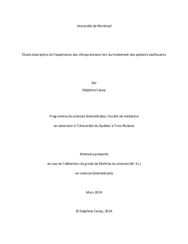 Caissy, Delphine (2024). Étude descriptive de l'expérience des chiropraticiens lors du traitement des patients vieillissants. Mémoire. Montréal ; Trois-Rivières, Université de Montréal ; Université du Québec à Trois-Rivières, 174 p.