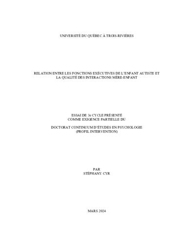 Cyr, Stéphany (2024). Relation entre les fonctions exécutives de l’enfant autiste et la qualité des interactions mère-enfant. Essai. Trois-Rivières, Université du Québec à Trois-Rivières, 105 p.