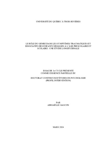 Gascon, Abigaëlle (2024). Le rôle du genre dans les symptômes traumatiques et disociatifs des enfants négligés à l’âge préscolaire et scolaire : une étude longitudinale. Essai. Trois-Rivières, Université du Québec à Trois-Rivières, 83 p.