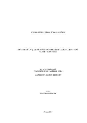 Gmakouba, Issaka (2024). Gestion de la qualité des projets en génie logiciel : facteurs clés et solutions. Mémoire. Trois-Rivières, Université du Québec à Trois-Rivières, 114 p.