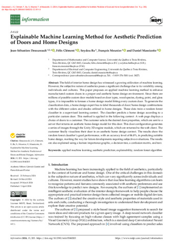 Dessureault, J.-S., Clément, F., Ba, S., Meunier, F. et Massicotte, D. (2024). Explainable machine learning method for aesthetic prediction of doors and home designs. Information, 15 (4). p. 203. ISSN 2078-2489 DOI 10.3390/info15040203