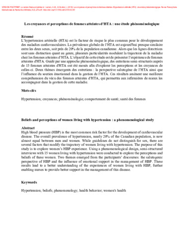 Leclerc, A.-M. et Cloutier, L. (2019). Les croyances et perceptions de femmes atteintes d’hypertension artérielle (HTA) : une étude phénoménologique. Revue Francophone Internationale de Recherche Infirmière, 5 (2). e73-e81. ISSN 2352-8028 DOI 10.1016/j.refiri.2019.02.001