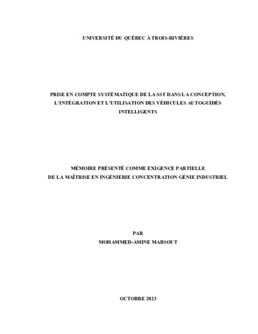 Mabsout, Mohammed-Amine (2023). Prise en compte systématique de la SST dans la conception, l’intégration et l’utilisation des véhicules autoguidés intelligents. Mémoire. Trois-Rivières, Université du Québec à Trois-Rivières, 131 p.