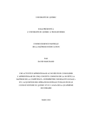 Marchand, David (2024). Une activité d’apprentissage au musée pour consolider l’apprentissage de cinq concepts communs de la société, la maîtrise de la compétence « Interpréter une réalité sociale » et l’acquisition des opérations intellectuelles pour le cours d’Histoire du Québec et du Canada de la quatrième secondaire. Essai. Trois-Rivières, Université du Québec à Trois-Rivières, 176 p.