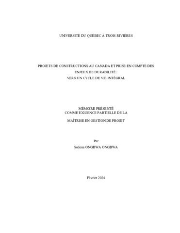 Ongbwa Ongbwa, Sedena (2024). Projets de constructions au Canada et prise en compte des enjeux de durabilité : vers un cycle de vie intégral. Mémoire. Trois-Rivières, Université du Québec à Trois-Rivières, 145 p.