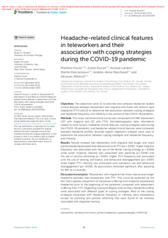 Houle, M., Ducas, J., Lardon, A., Descarreaux, M., Marchand, A.-A. et Abboud, J. (2023). Headache-related clinical features in teleworkers and their association with coping strategies during the COVID-19 pandemic. Frontiers in Public Health, 11 . Article 1303394. ISSN 2296-2565 DOI 10.3389/fpubh.2023.1303394