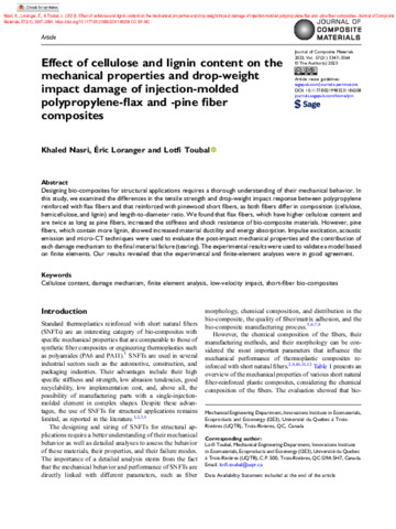 Nasri, K., Loranger, E. et Toubal, L. (2023). Effect of cellulose and lignin content on the mechanical properties and drop-weight impact damage of injection-molded polypropylene-flax and -pine fiber composites. Journal of Composite Materials, 57 (21). pp. 3347-3364. ISSN 0021-9983 1530-793X DOI 10.1177/00219983231186208