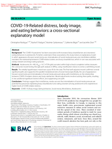 Rodrigue, C., Rodgers, R. F., Carbonneau, N., Bégin, C. et Dion, J. (2024). COVID-19-Related distress, body image, and eating behaviors: A cross-sectional explanatory model. BMC Psychology, 12 (1). p. 117. ISSN 2050-7283 DOI 10.1186/s40359-024-01613-z