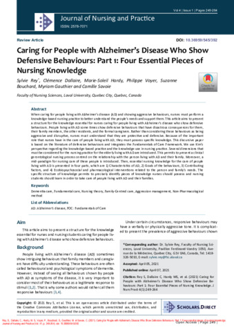 Rey, S., Dallaire, C., Hardy, M.S., Voyer, P., Bouchard, S., Gauthier, M. et Savoie, C. (2021). Caring for people with Alzheimer's disease who show defensive behaviours. Part 1: Four essential pieces of nursing knowledge. Journal of Nursing and Practice, 41 (1). pp. 249-264. ISSN 2578-7071 DOI 10.36959/545/392