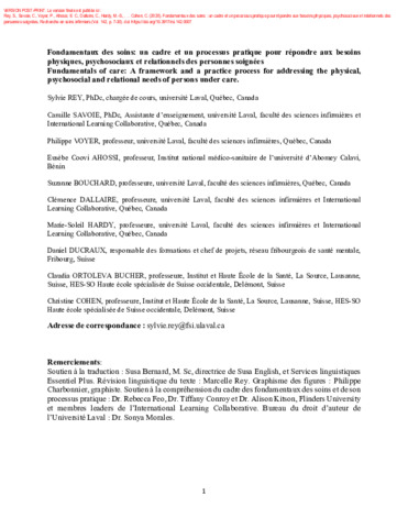 Rey, S., Savoie, C., Voyer, P., Ahossi, E. C., Dallaire, C., Hardy, M.-S., Ducraux, D., Ortoleva Bucher, C. et Cohen, C. (2020). Fondamentaux des soins : un cadre et un processus pratique pour répondre aux besoins physiques, psychosociaux et relationnels des personnes soignées. Recherche en soins infirmiers, 142 (3). pp. 7-30. ISSN 0297-2964 DOI 10.3917/rsi.142.0007