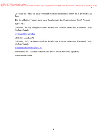 Rey, S. et Dallaire, C. (2021). Le sentier en spirale du développement du savoir infirmier : l’apport de la proposition de Reed. Recherche en soins infirmiers, 144 (1). pp. 54-63. ISSN 0297-2964 DOI 10.3917/rsi.144.0054