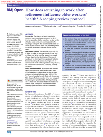 Lecours, A., Lord, M. M., Negrini, A. et Robitaille, R. (2019). How does returning to work after retirement influence older workers' health? A scoping review protocol. BMJ Open, 9 (3). Article e026446. ISSN 2044-6055 DOI 10.1136/bmjopen-2018-026446