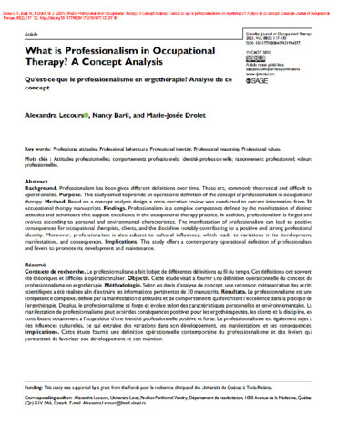 Lecours, A., Baril, N. et Drolet, M. J. (2021). What is professionalism in occupational therapy? A concept analysis = Qu’est-ce que le professionnalisme en ergothérapie? Analyse de ce concept. Canadian Journal of Occupational Therapy, 88 (2). pp. 117-130. ISSN 0008-4174 1911-9828 DOI 10.1177/0008417421994377