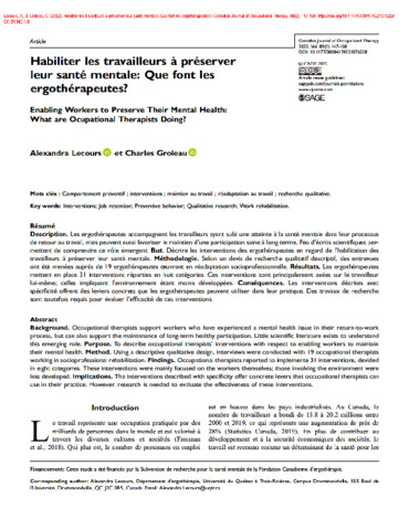 Lecours, A. et Groleau, C. (2022). Habiliter les travailleurs à préserver leur santé mentale: que font les ergothérapeutes? Canadian Journal of Occupational Therapy, 89 (2). pp. 147-158. ISSN 0008-4174 1911-9828 DOI 10.1177/00084174221076228
