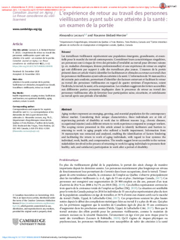 Lecours, A. et Bédard-Mercier, R. (2023). L’expérience de retour au travail des personnes vieillissantes ayant subi une atteinte à la santé : un examen de la portée. Canadian Journal on Aging / La Revue canadienne du vieillissement, 42 (1). pp. 1-12. ISSN 0714-9808 1710-1107 DOI 10.1017/S0714980822000095