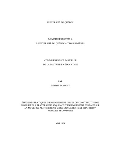 D'Aoust, Demmy (2024). Étude des pratiques d’enseignement issues du constructivisme mobilisées à travers une séquence d’enseignement portant sur la moyenne arithmétique dans un contexte de transition primaire-secondaire. Mémoire. Trois-Rivières, Université du Québec à Trois-Rivières, 296 p.