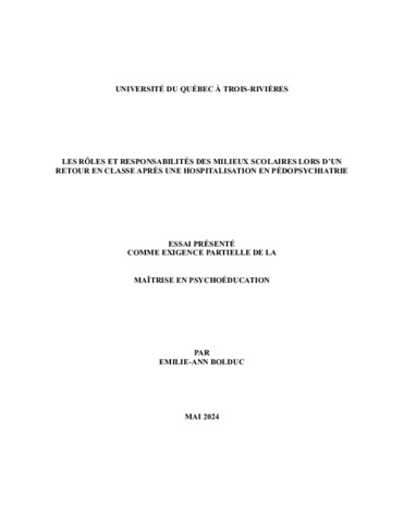 Bolduc, Emilie-Ann (2024). Les rôles et responsabilités des milieux scolaires lors d’un retour en classe après une hospitalisation en pédopsychiatrie. Essai. Trois-Rivières, Université du Québec à Trois-Rivières, 31 p.