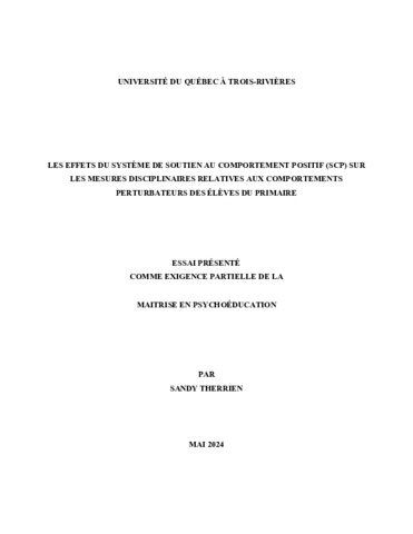 Therrien, Sandy (2024). Les effets du système de soutien au comportement positif (SCP) sur les mesures disciplinaires relatives aux comportements perturbateurs des élèves du primaire. Essai. Trois-Rivières, Université du Québec à Trois-Rivières, 37 p.