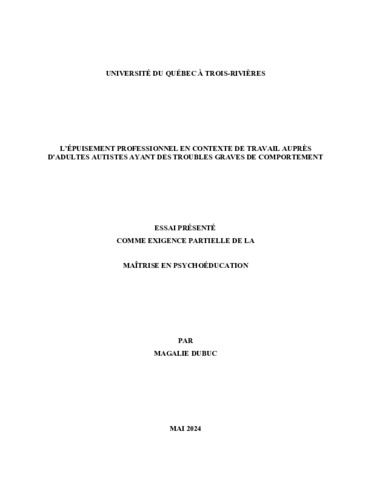 Dubuc, Magalie (2024). L’épuisement professionnel en contexte de travail auprès d’adultes autistes ayant des troubles graves de comportement. Essai. Trois-Rivières, Université du Québec à Trois-Rivières, 39 p.