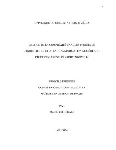 Coulibaly, Macki (2024). Gestion de la complexité dans les projets de l’industrie 4.0 et de la transformation numérique : étude de cas exploratoire Noovelia. Mémoire. Trois-Rivières, Université du Québec à Trois-Rivières, 106 p.