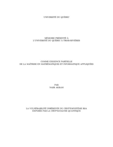 Nasr, Akram (2024). La vulnérabilité inhérente du cryptosystème RSA exposée par la cryptanalyse quantique. Mémoire. Trois-Rivières, Université du Québec à Trois-Rivières, 91 p.