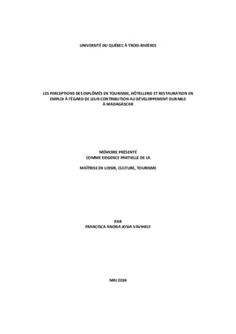 Vavihely, Francisca Anona Josia (2024). Les perceptions des diplômés en tourisme, hôtellerie et restauration en emploi à l’égard de leur contribution au développement durable à Madagascar. Mémoire. Trois-Rivières, Université du Québec à Trois-Rivières, 90 p.
