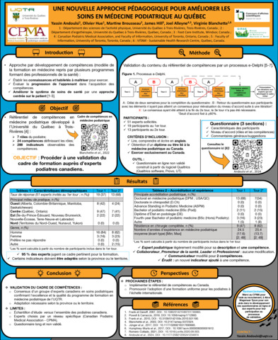 Andoulsi, Yassin, Hue, Olivier, Brousseau, Martine, Hill, James, Alleyne, Joel et Blanchette, Virginie (2024). Une nouvelle approche pédagogique pour améliorer les soins en médecine pédiatrique au Québec. [Affiche]