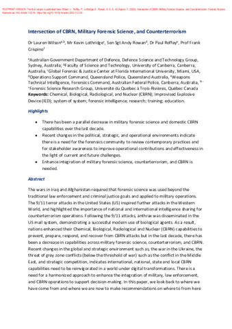Wilson, L., Roffey, P., Lothridge, K., Rowan, Sen Sgt. A. et Crispino, F. (2024). Intersection of CBRN, military forensic science, and counterterrorism. Forensic Science International, 364 . Article 112218. ISSN 0379-0738 1872-6283 DOI 10.1016/j.forsciint.2024.112218