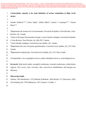 Paillassa, J., Pepin, S., Ethier, G., Lamarque, L. J. et Maire, V. (2024). Carboxylation capacity is the main limitation of carbon assimilation in High Arctic shrubs. Plant, Cell & Environment, 47 (12). pp. 5315-5329. ISSN 0140-7791 1365-3040 DOI 10.1111/pce.15097