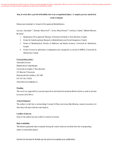 Lecours, A., Durand, M. J., Coutu, M. F., Groleau, C. et Bédard-Mercier, R. (2022). Stay at work after a period of disability due to an occupational injury: A complex process marked by social exchanges. Journal of Occupational Rehabilitation, 32 (2). pp. 319-328. ISSN 1053-0487 1573-3688 DOI 10.1007/s10926-021-10008-5