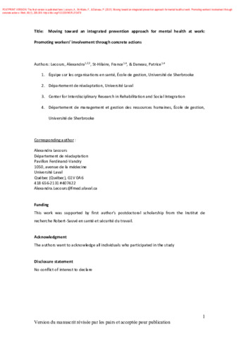 Lecours, A., St-Hilaire, F. et Daneau, P. (2021). Moving toward an integrated prevention approach for mental health at work: Promoting workers' involvement through concrete actions. Work, 69 (1). pp. 295-306. ISSN 1051-9815 1875-9270 DOI 10.3233/WOR-213478