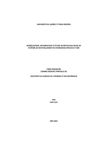 Luo, Hao (2024). Modélisation, optimisation et étude de protocole pour un système de ravitaillement en hydrogène efficace et sûr. Thèse. Trois-Rivières, Université du Québec à Trois-Rivières, 193 p.